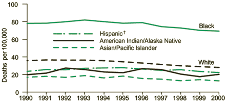 • Decreases in prostate cancer death rates during 1990–1999 were almost twice as great for whites and Asian/Pacific Islanders than they were for African Americans, American Indian/Alaska Natives, and Hispanics.